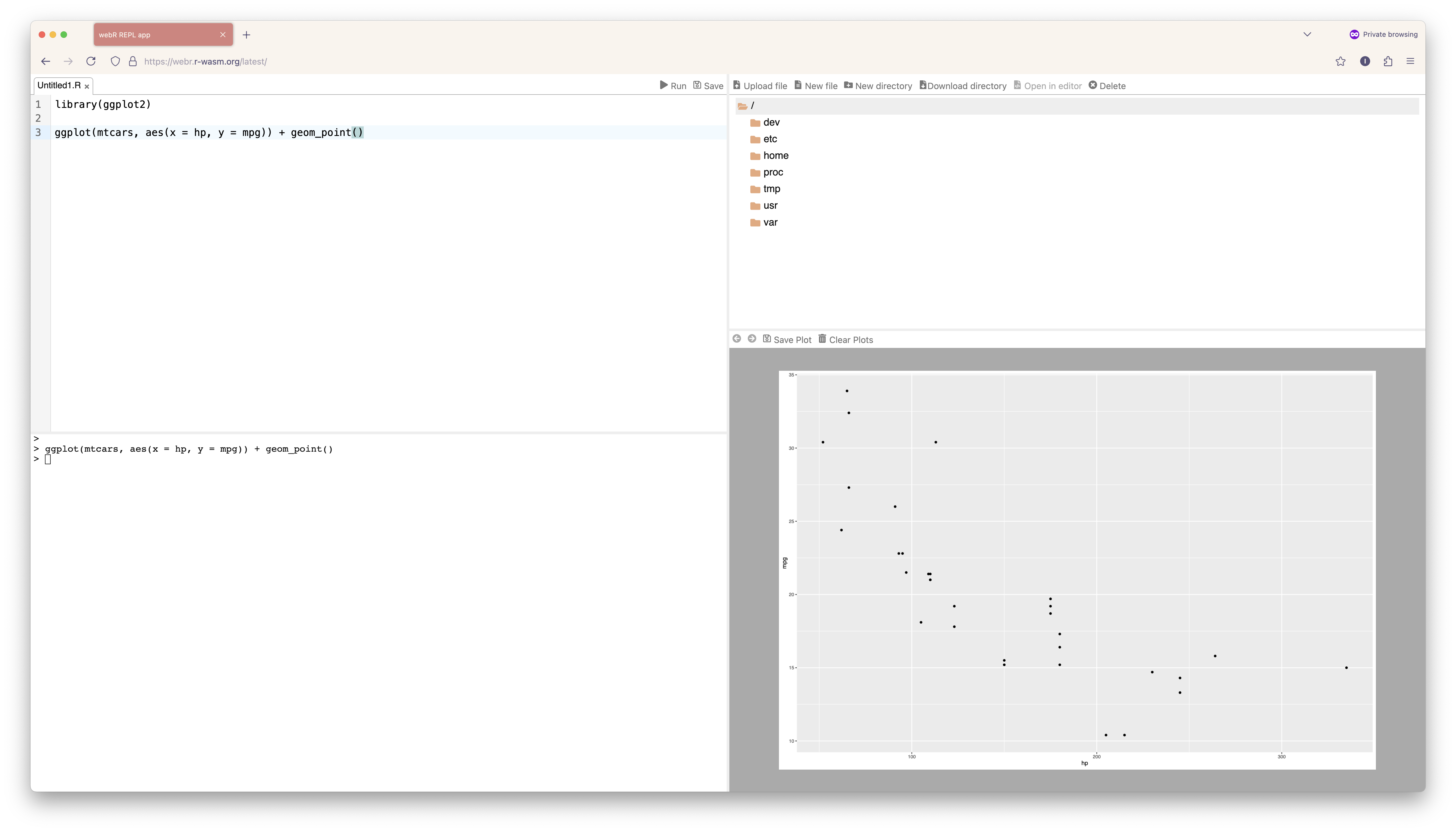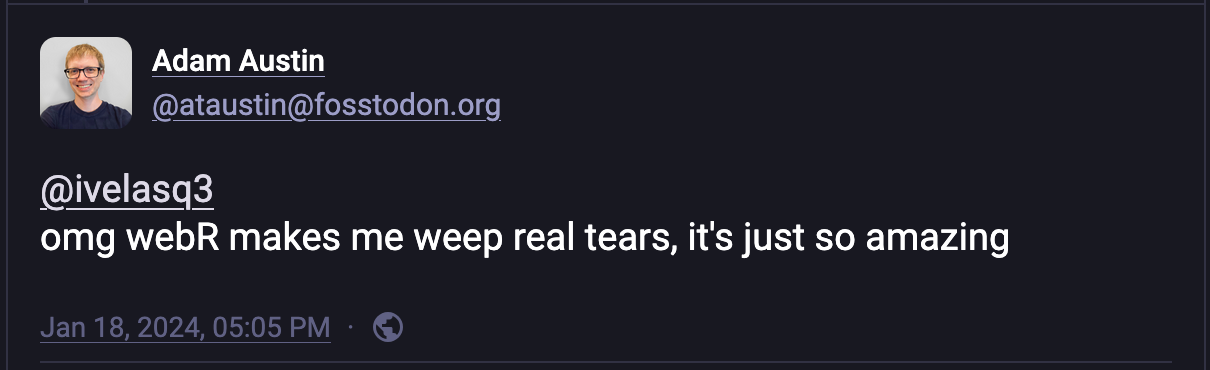 webr code chunk for Rpyodide code chunk for PythonCan be used in presentations too: